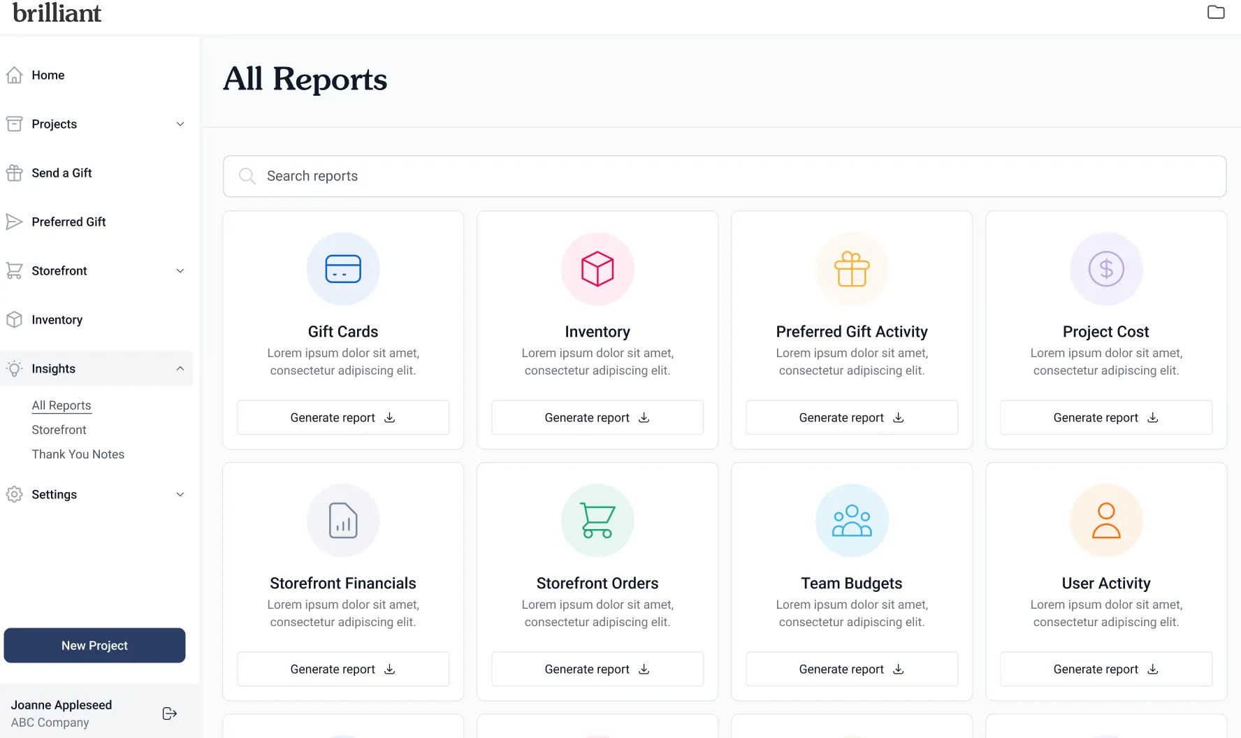 Categorized Spend Report: Pull all of your Brilliant Invoice Spend Data across Projects, Storefronts, Preferred Gift Campaigns and Monthly Statement Invoices into a single report. Slice and dice by spend categories like product, shipping, fulfillment fees, taxes, credits and more.