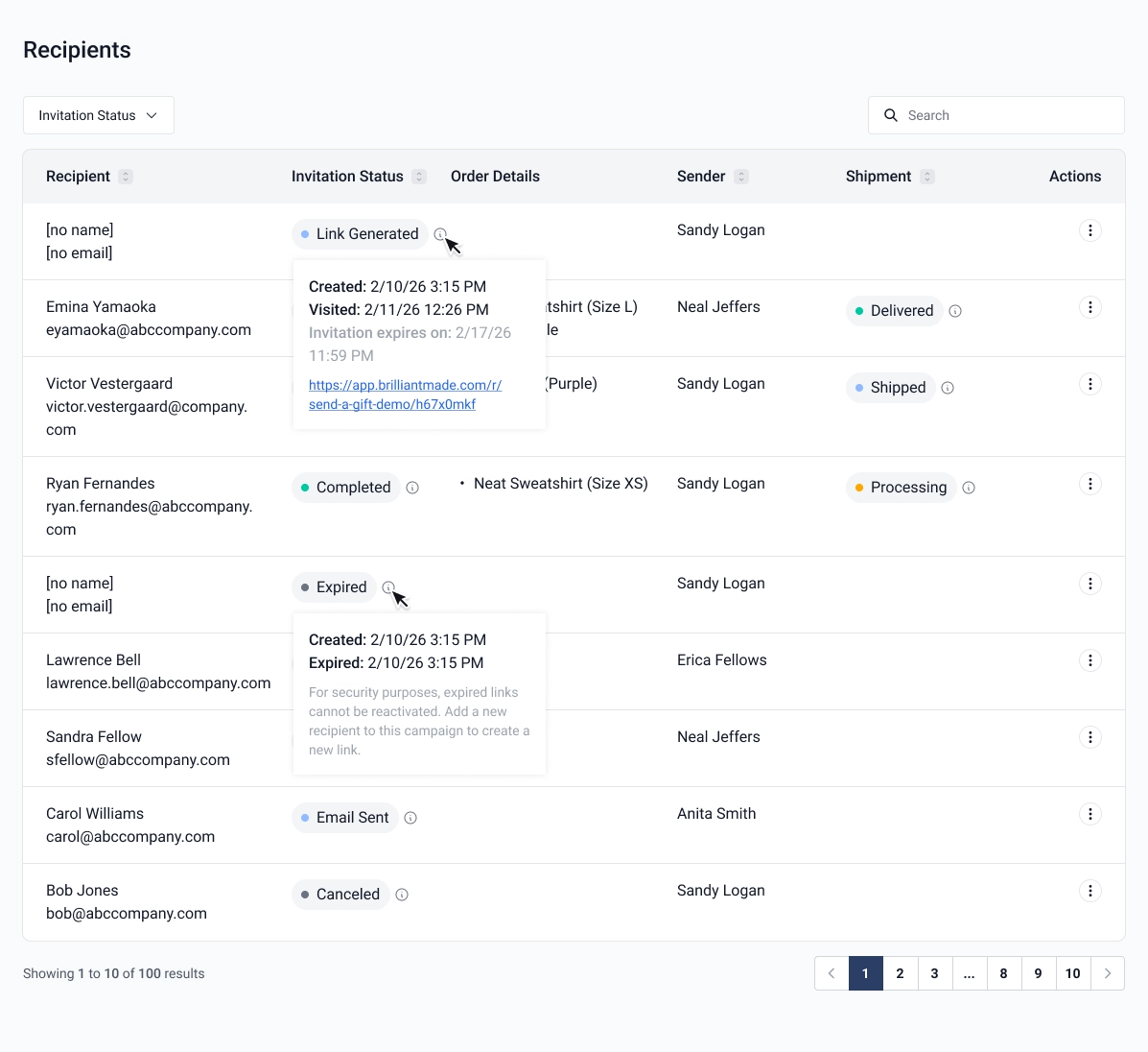 Links will now have an Expire At date and time stamp in the Preferred Gift Campaign admin dashboard. The dashboard shows both when the link will expire and when the link has expired, as seen below in the hover state for Invitation Status.