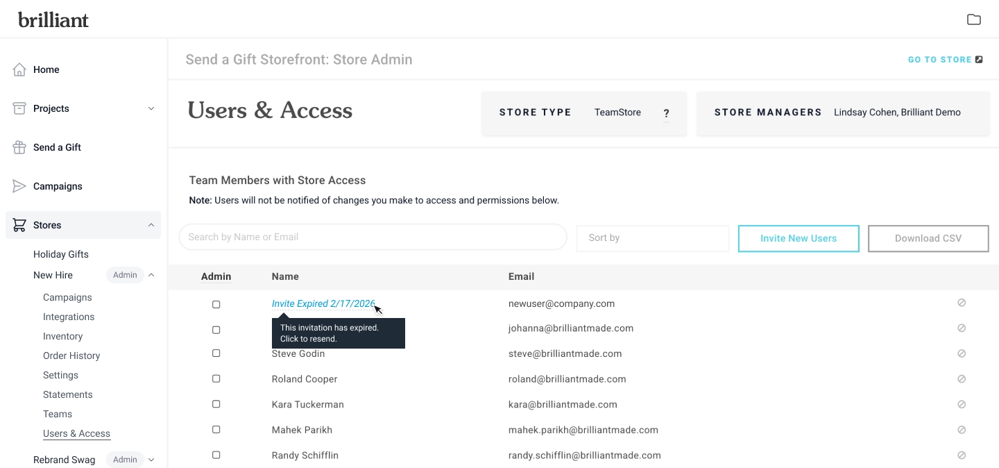 Admin users will be able to see that a user’s invitation has expired under Storefront > Users & Access. Hover over the ‘Invite Expired’ message and then click the text to resend the invitation to the user in question.