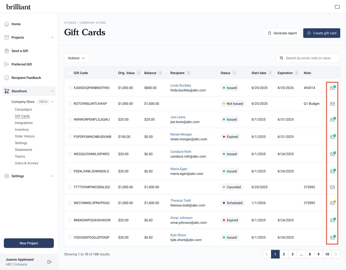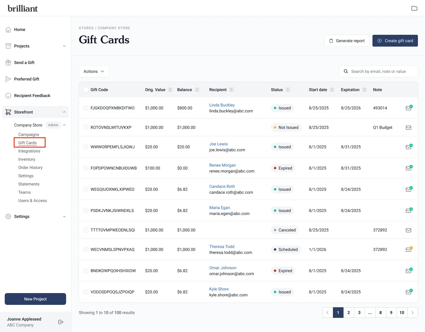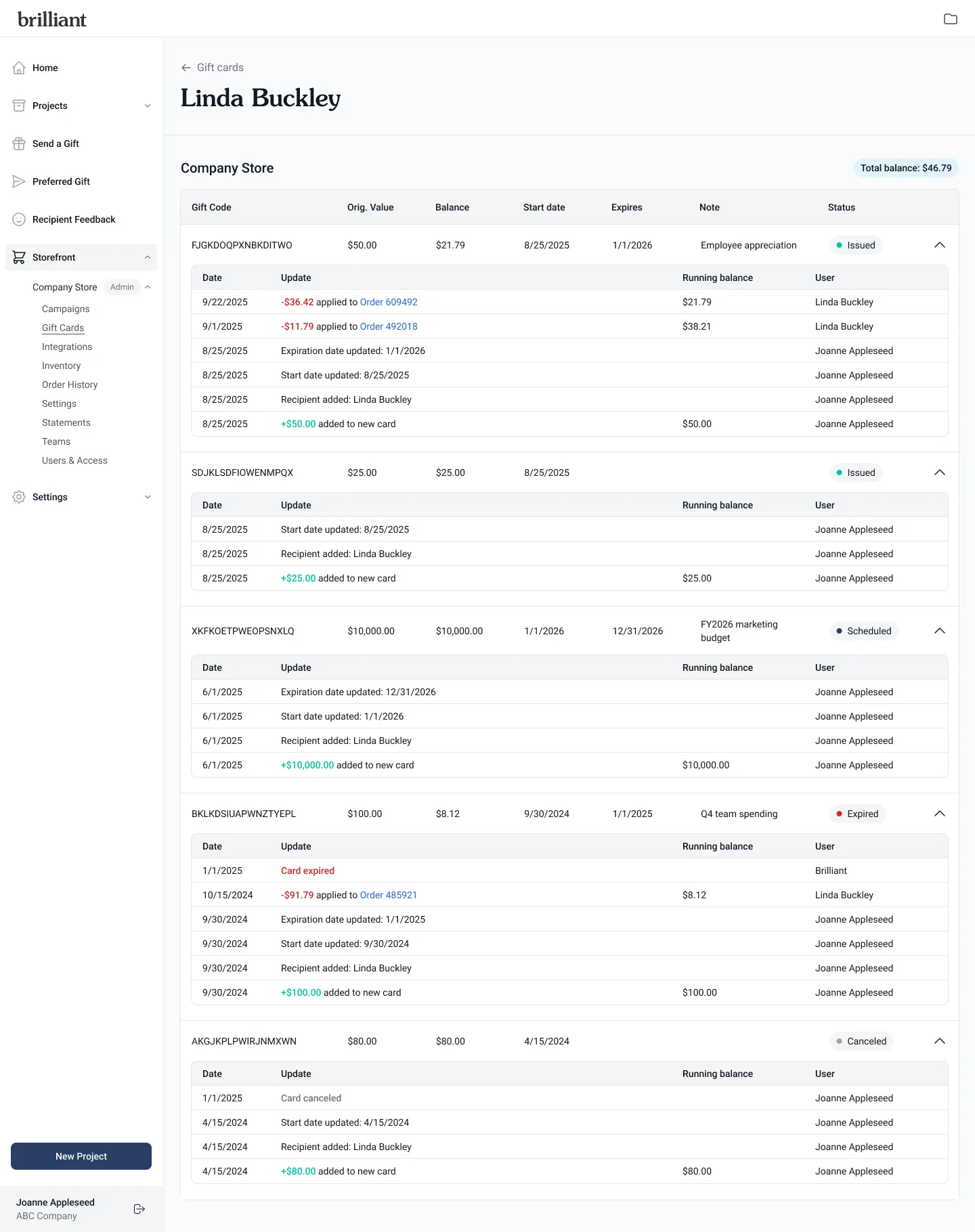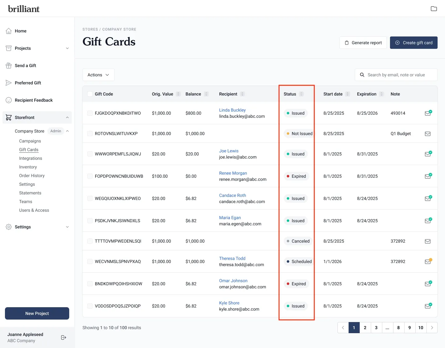 Each gift card also displays a status in the table: