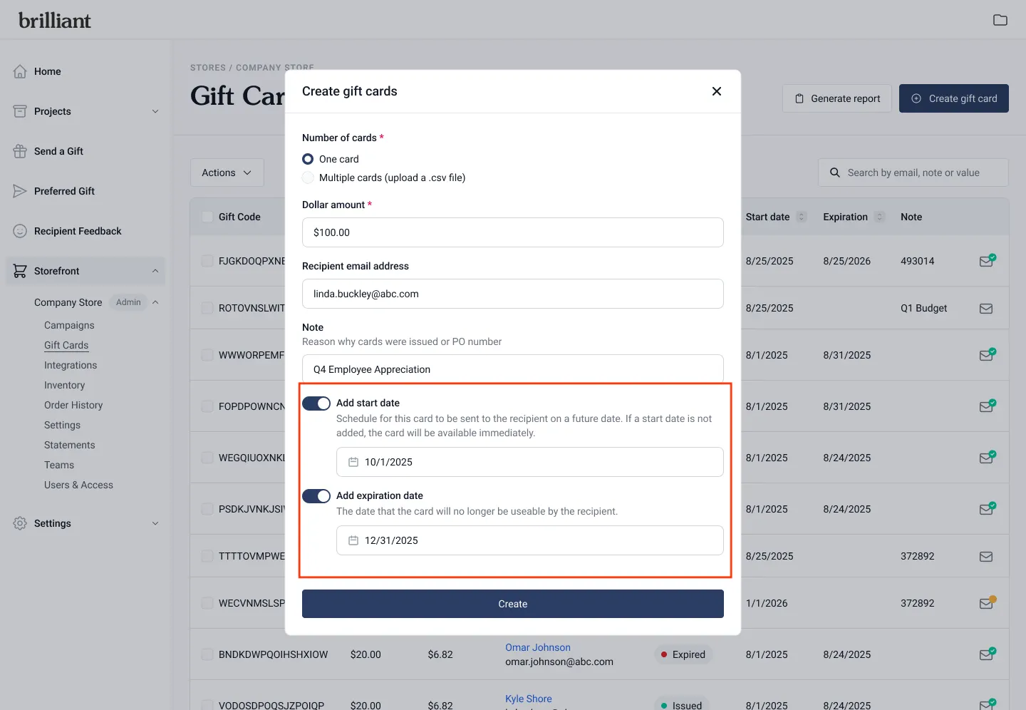 When creating or editing a gift card, toggle on Add Start Date and/or Add Expiration Date.