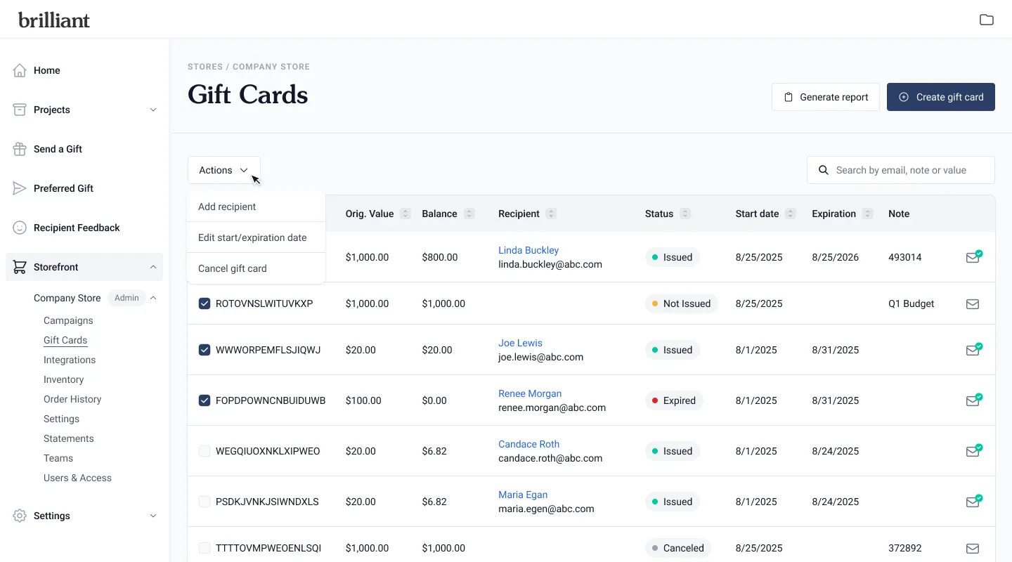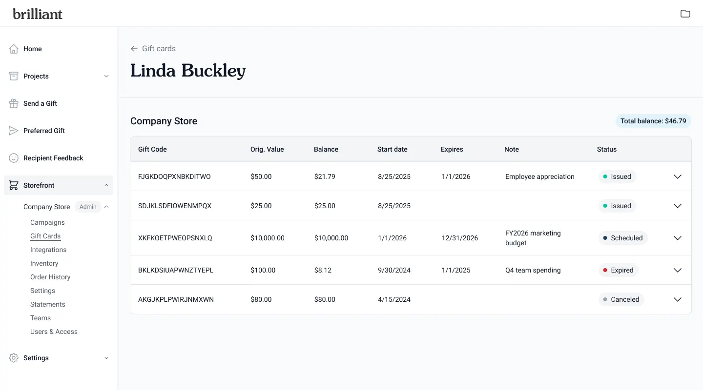 You’ll see a table displaying all gift cards for that Storefront, including their amount, recipient, note, start and expiration dates, and current status.
