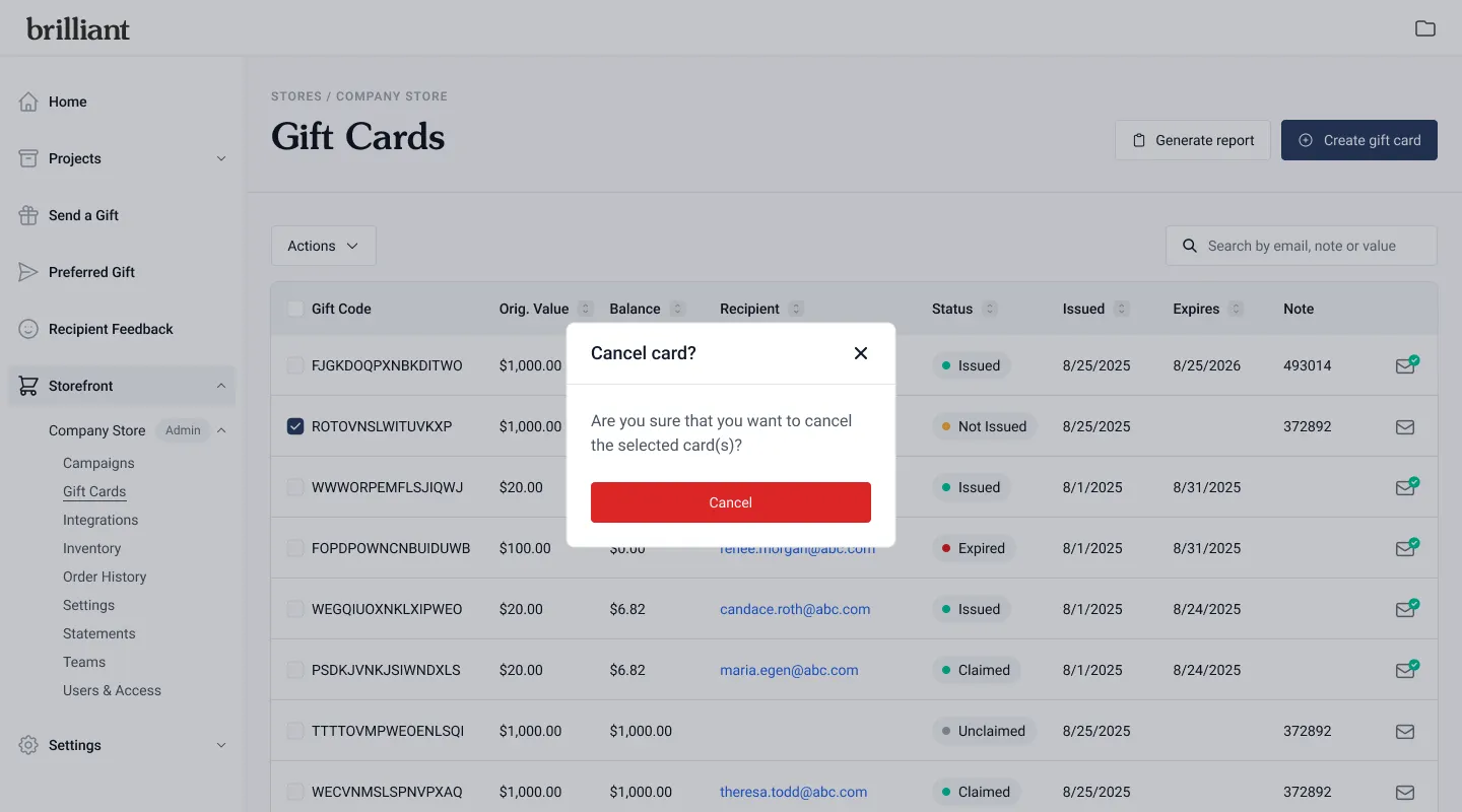 Cancel Gift Card: Deactivate one or more cards immediately.
