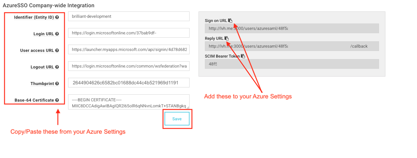 Enter the Bi-Directional links between your new Azure SAML Application and your Brilliant Company-level Azure Integration. The following screenshots should help you with this.