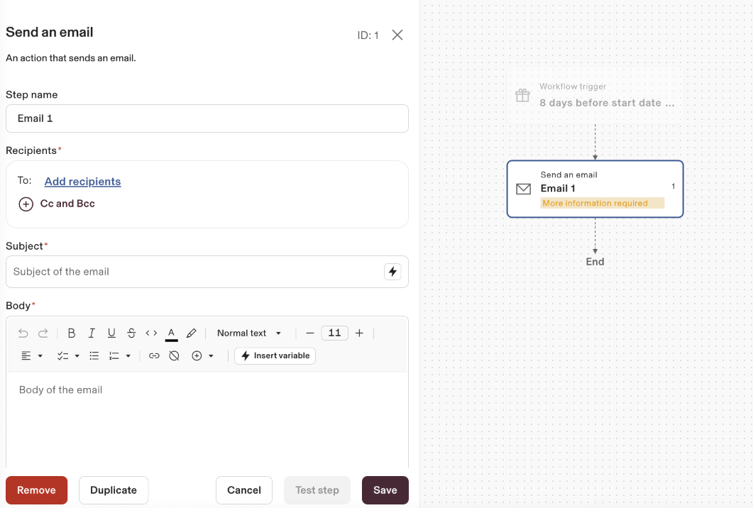 Select the email action in the workflow, then configure the email with the below settings. Where applicable, please use the insert variables button (lightning bolt icon) to replace the text in square brackets with dynamic variables: