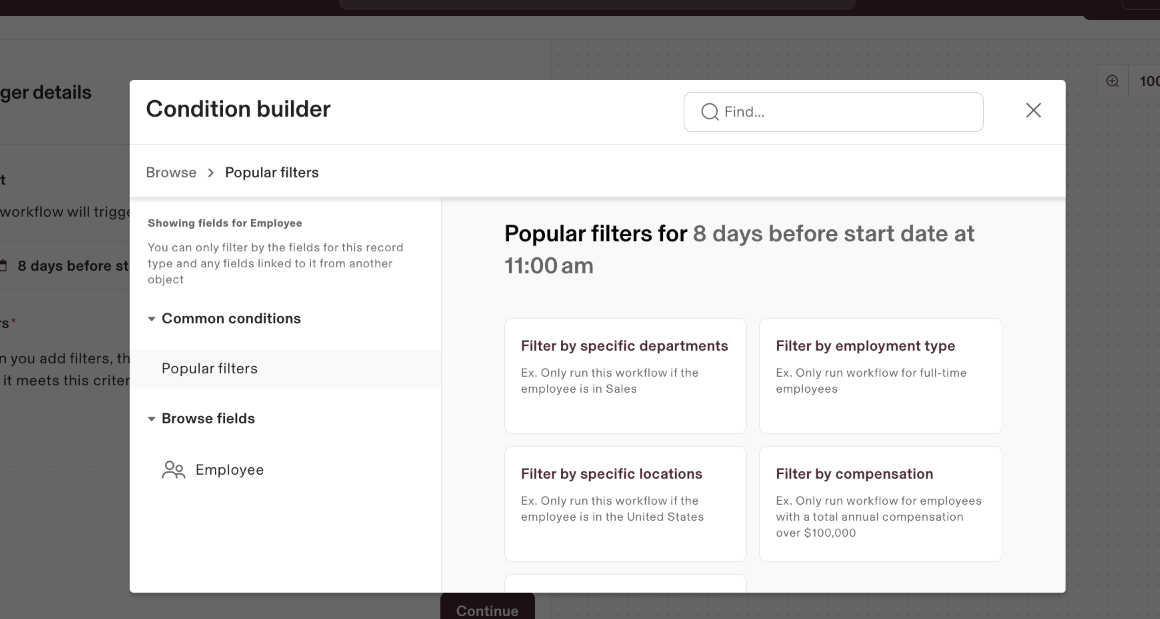 If you are setting up this workflow to automate new hire gifts, we recommend you set the workflow to trigger on or after an employee's start date to ensure that all required information (such as employee email) is present at the time that the workflow runs.