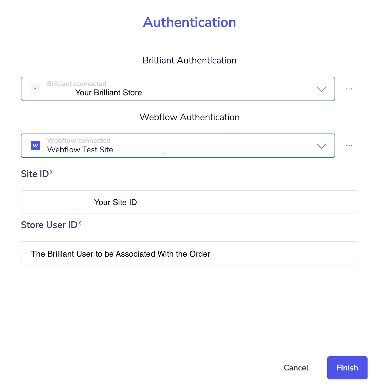 For Brilliant, the account will be added for you, so you can skip to adding your Webflow information.