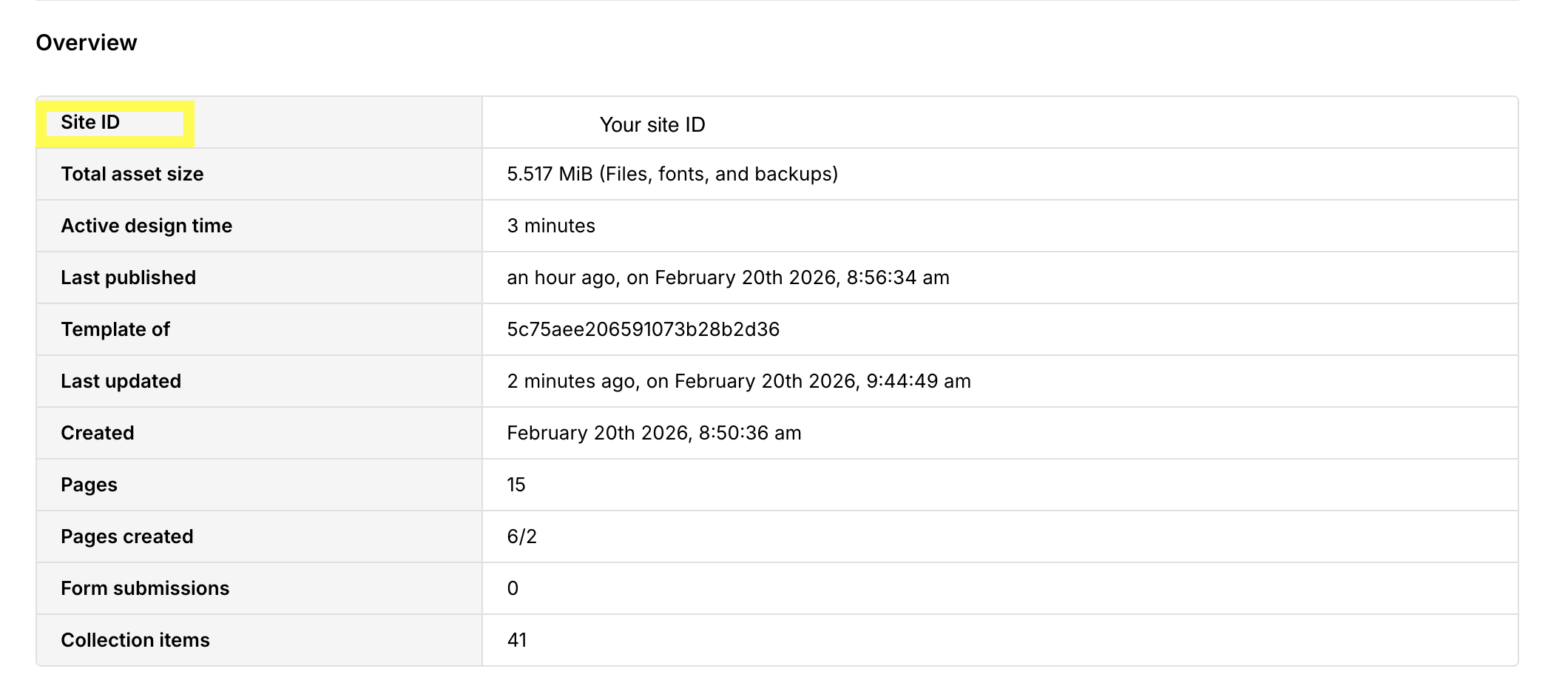 On the General tab, scroll down until you get to the Overview section. Then take note of the Site ID. This ID will be used later in the integration connection process.