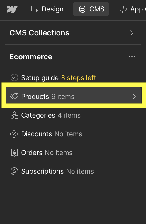On the menu that appears on the left side of the page, click on the Products collection. Please note that all products in your Ecommerce store must reside in this collection for the Brilliant integration to work properly.
