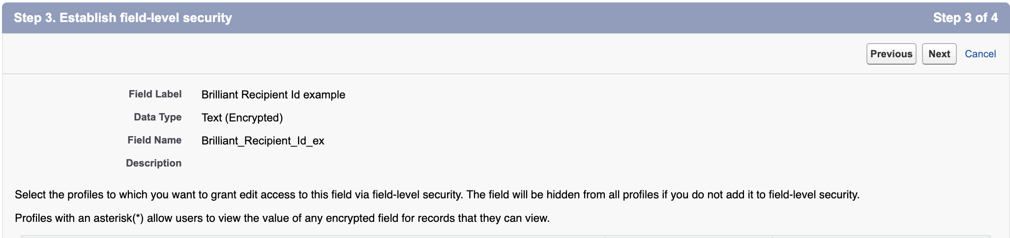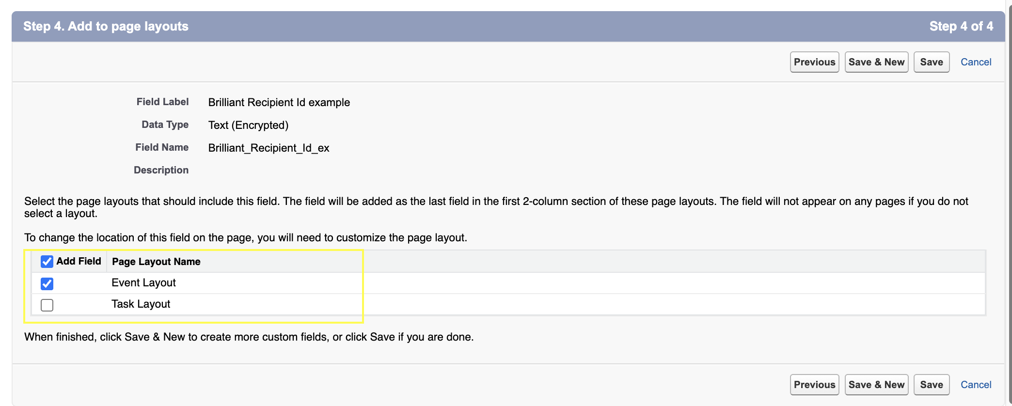 Enter Brilliant Recipient Id in the Field Label. After doing this, the Field Name should be auto-populated with Brilliant_Recipient_Id. Please make sure that the value in Field Name is exactly Brilliant_Recipient_Id.