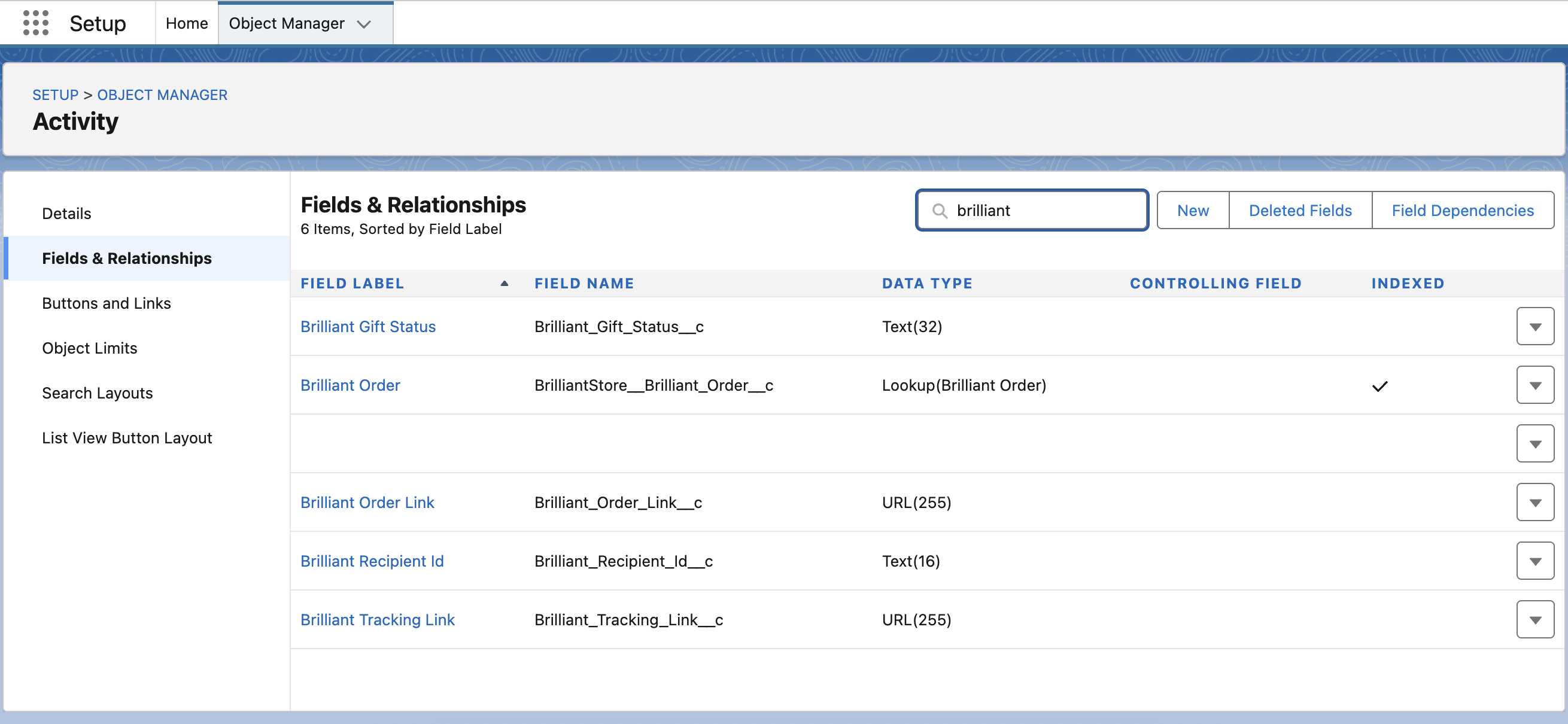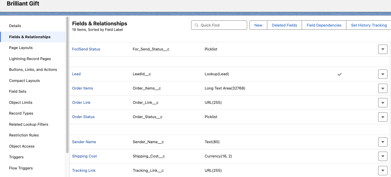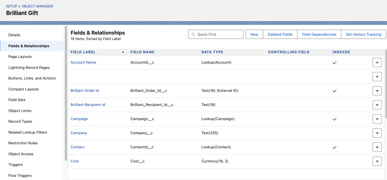 Depending on how you configure the automation in later steps, the integration will push data from Brilliant to a custom gift object in your Salesforce instance when gift orders are placed. You will need to create this custom object according to the instructions below: