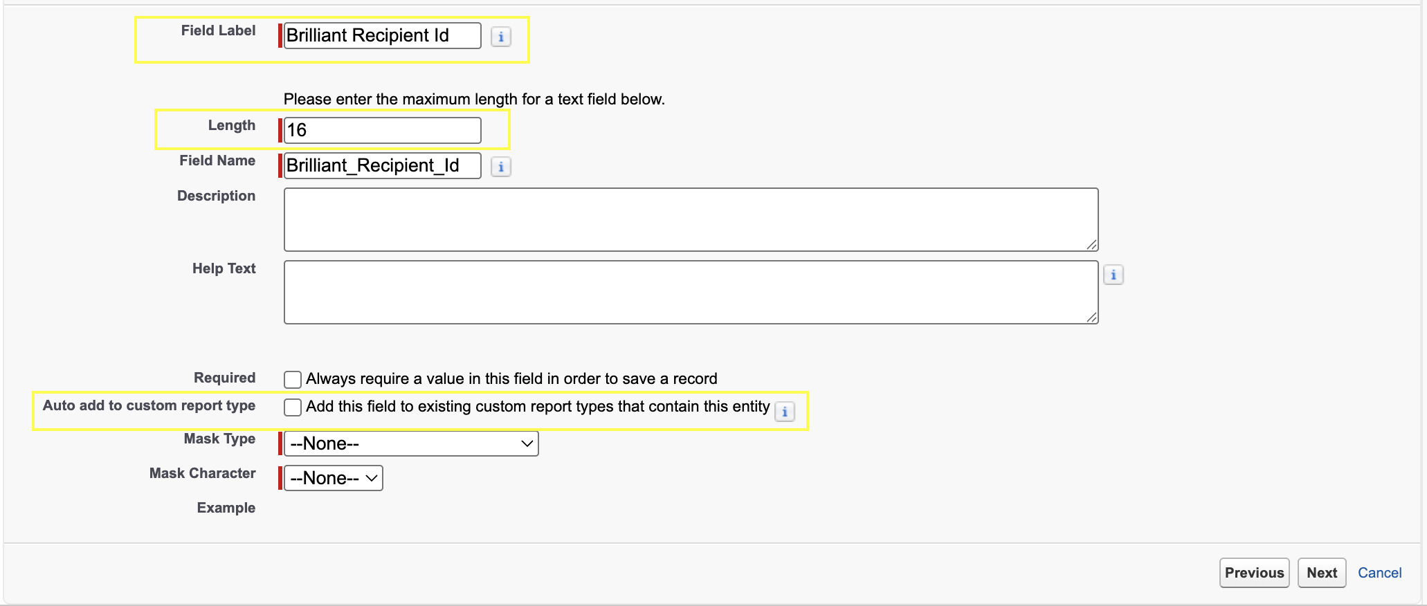 Brilliant Recipient Id: A text field 16 characters in length with a field name set to Brilliant_Recipient_Id when creating the field. Please also check the External ID box when creating the field.