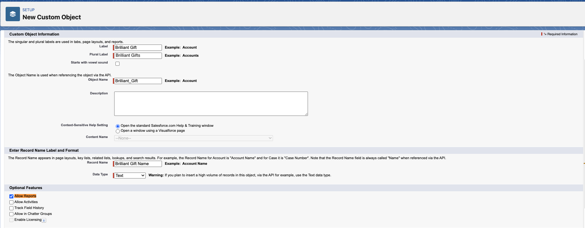 For the Label, enter Brilliant Gift. After doing this, the Object Name should be auto-populated with Brilliant_Gift. Please make sure that the value in Object Name is exactly Brilliant_Gift. For the Plural Label, enter Brilliant Gifts.