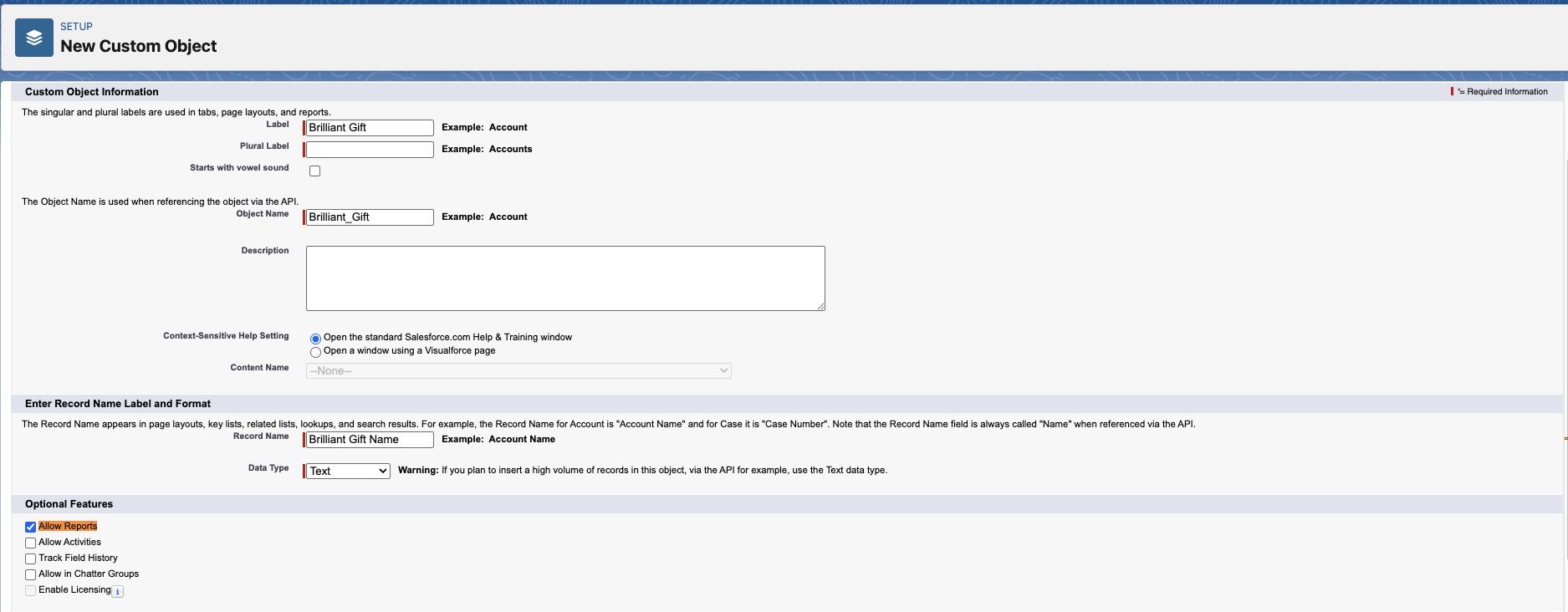 For the Label, enter Brilliant Gift. After doing this, the Object Name should be auto-populated with Brilliant_Gift. Please make sure that the value in Object Name is exactly Brilliant_Gift. For the Plural Label, enter Brilliant Gifts.