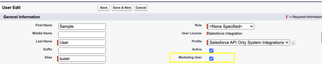 To connect your Salesforce org to the integration, you will authenticate using the credentials from a Salesforce user in your org. We recommend creating a new user specifically for the Brilliant integration. You can create a new user or edit an existing user via the Users page in your Salesforce setup. For the integration to be fully functional, please mark the user as a Marketing User under the General Information section of the user's edit page.