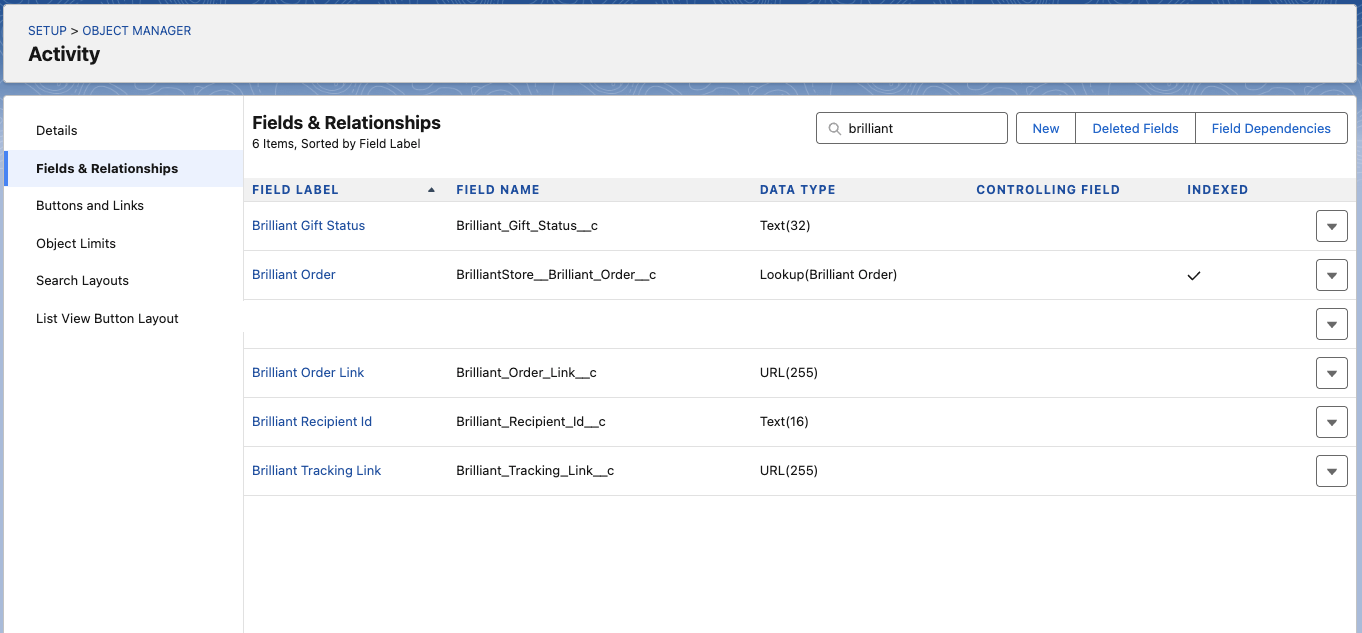 Brilliant Order Id: A text field 16 characters in length with a field name set to Brilliant_Order_Id when creating the field. Please also check the External ID box when creating the field.