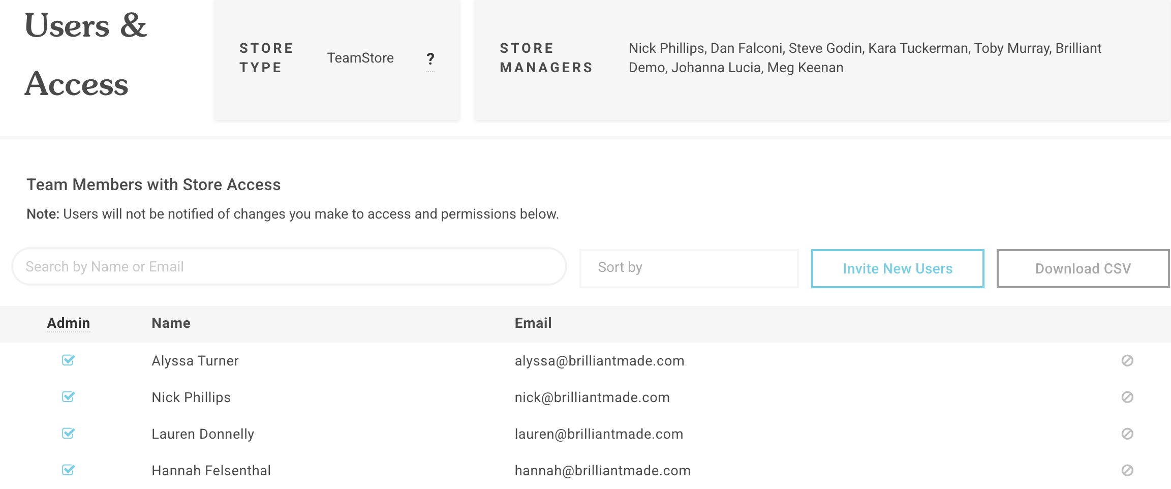 View existing users, invite new users, download a list of your users and manage Admin level access permissions from the Users & Access page.