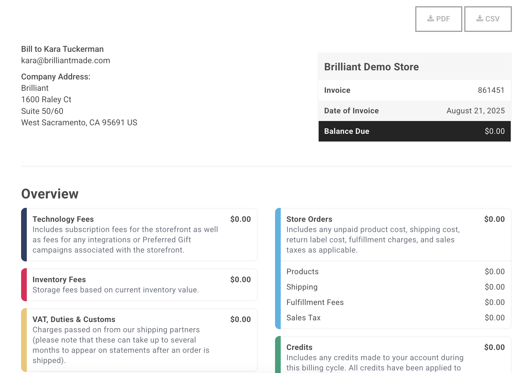 See all your Storefront's monthly statements here. Click the Statement # in the Invoice column to be taken to the Statement detail view where you can easily see statement summary and line items, or download a PDF or CSV version of your statement.