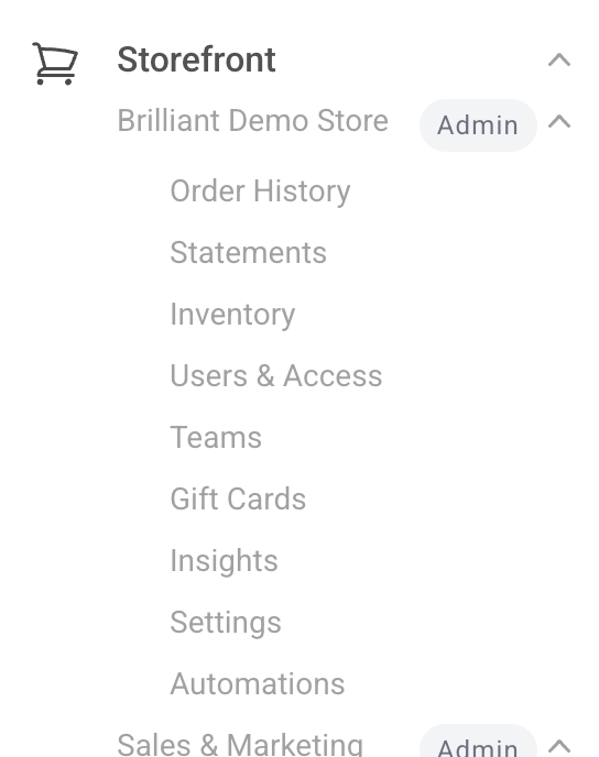 Users can access the admin settings for any Storefront they have Admin level access to by navigating to https://app.brilliantmade.com/dashboard and scrolling down to Storefront on the left hand nav panel. If you have Admin access, you'll see the 'Admin' icon next to the Storefront's name.