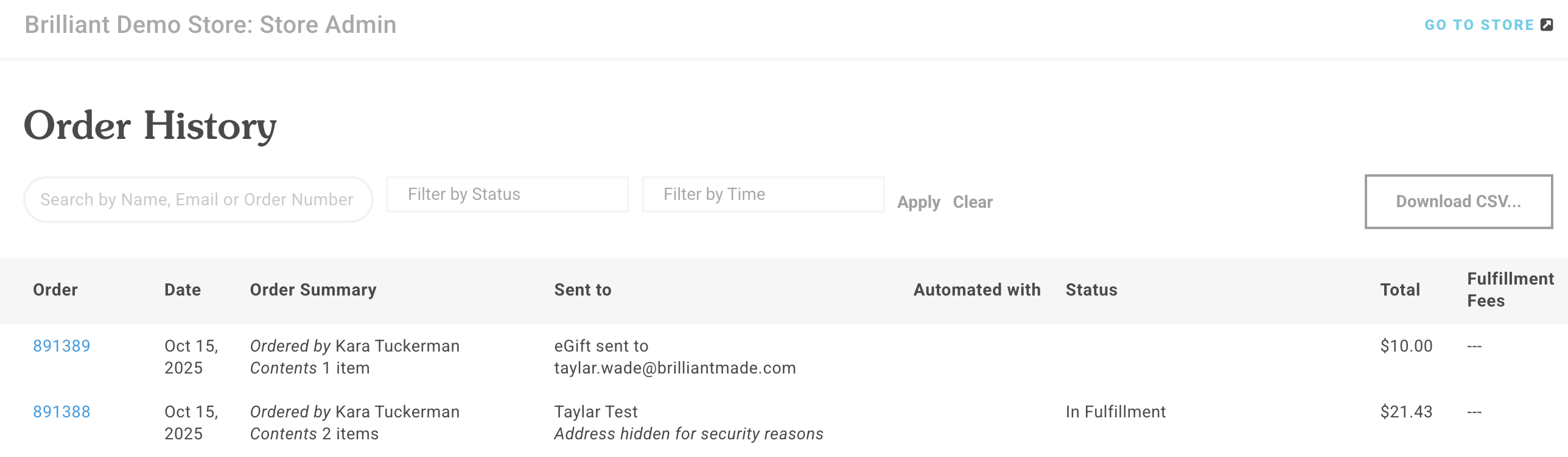Search for specific orders by recipient Name, Email Address or Order Number. Filter orders by order Status or by Time (date placed). See our Order Statuses here.