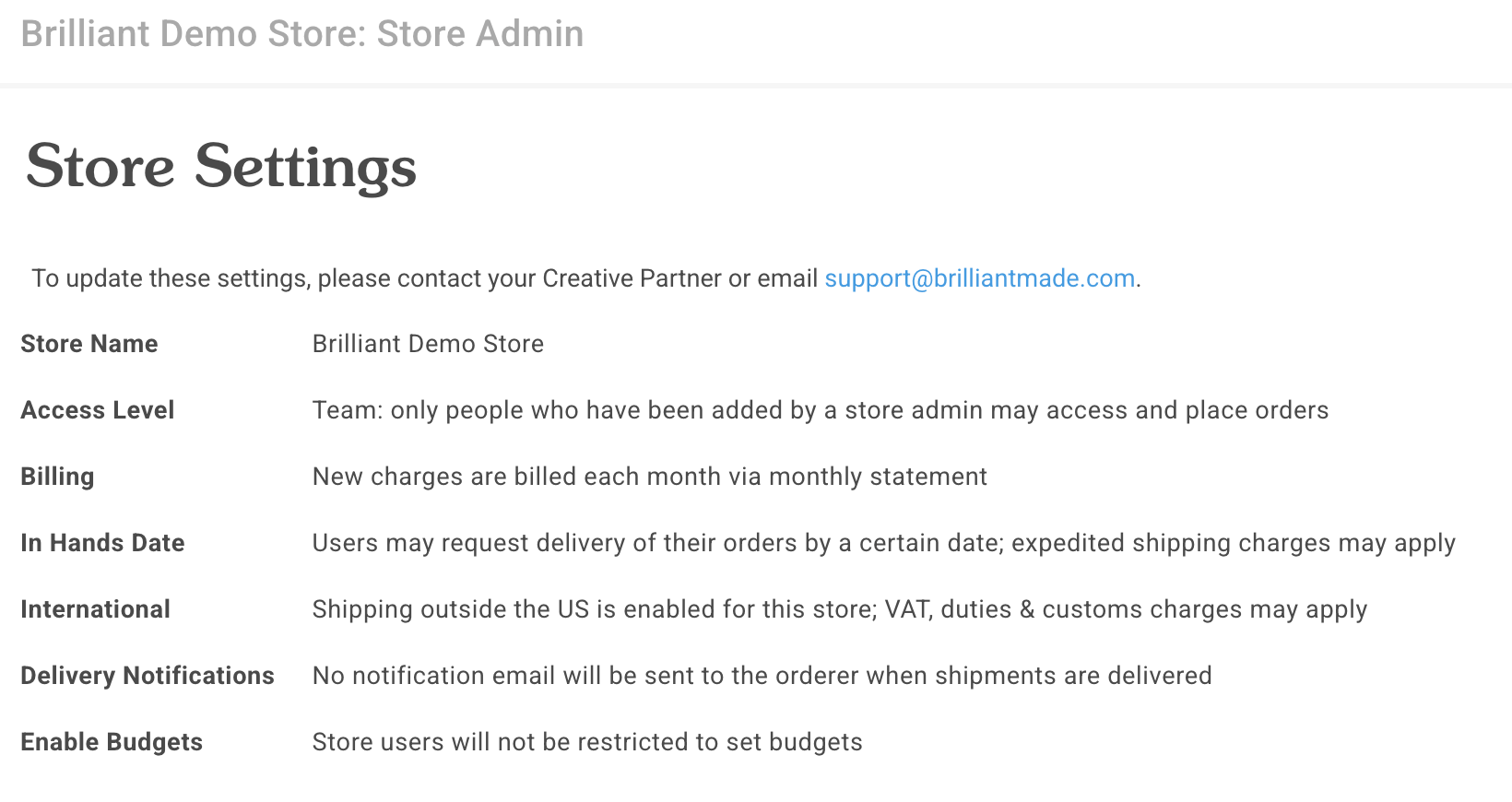 To see a quick summary of Settings for your Storefront, navigate to the Settings page. To change any of these settings, reach out to your Brilliant team or email [email protected].