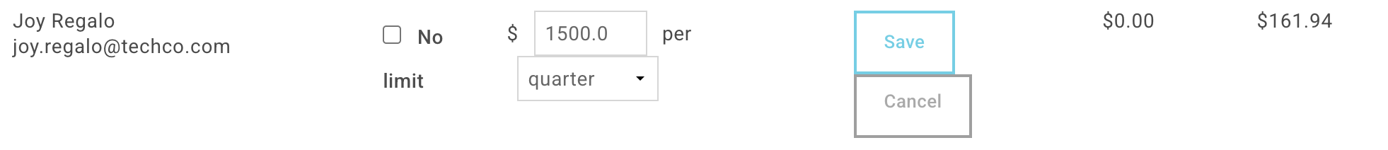 In the table, search to find the user whose budget you'd like to change and click Edit next to their name to open the edit budget module. Choose No Limit or set a dollar amount by day, week, month, quarter or year. Click Save to immediately apply these changes to the users budget.