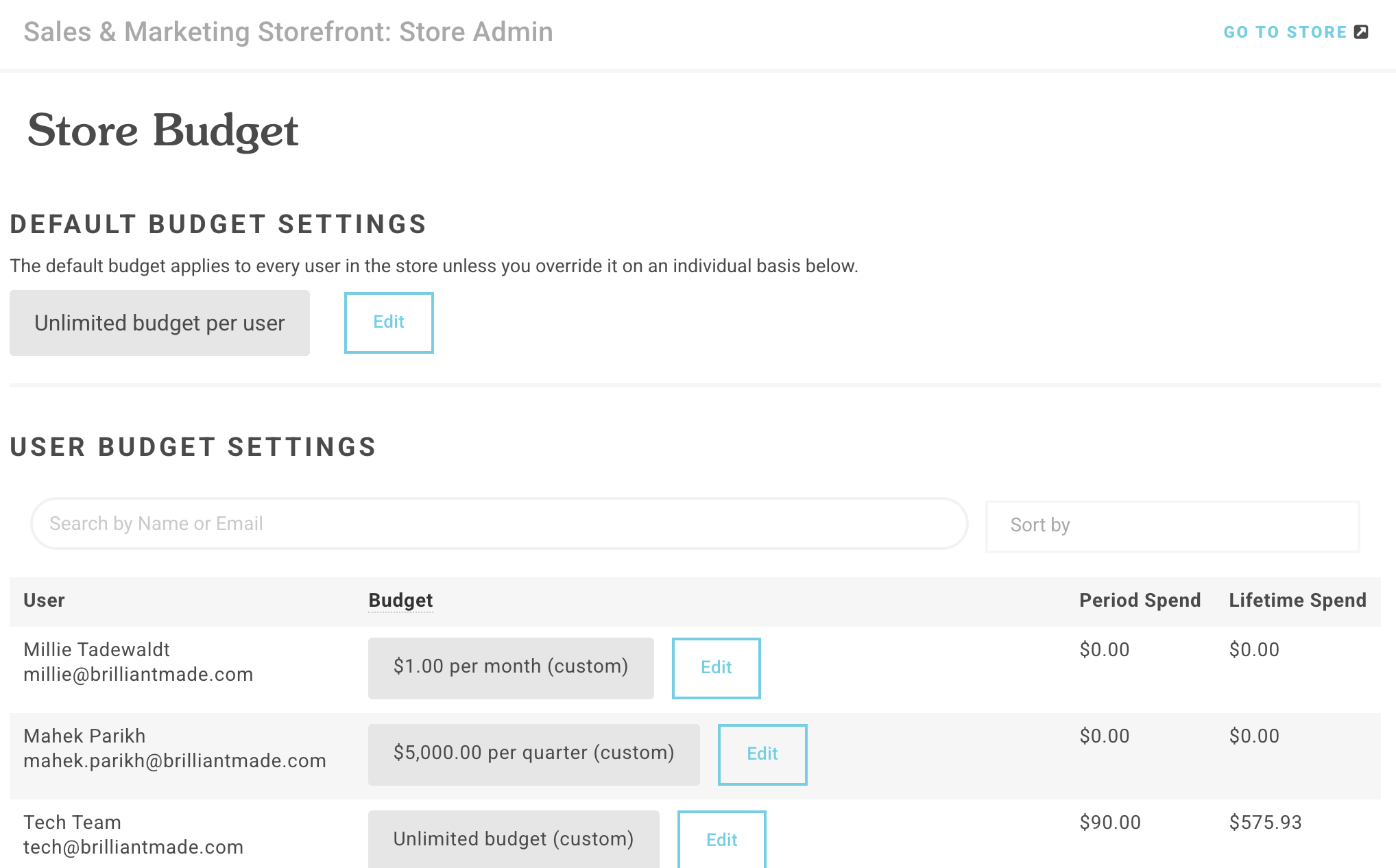 Admins can control Store User Budgets in the Budgets section under any given Storefront in their Brilliant Dashboard in the admin panel.